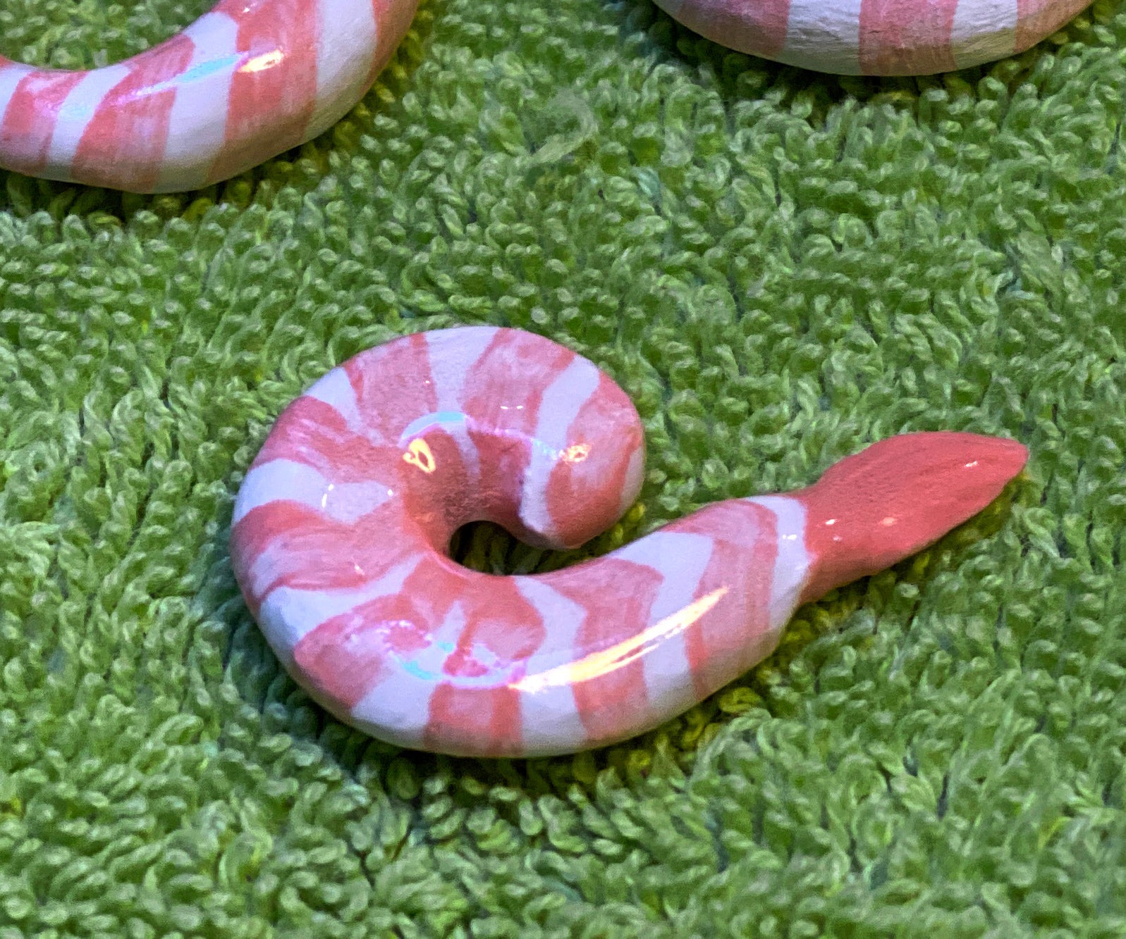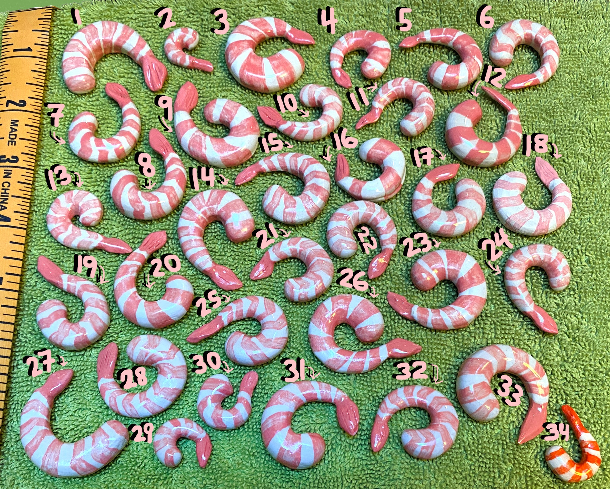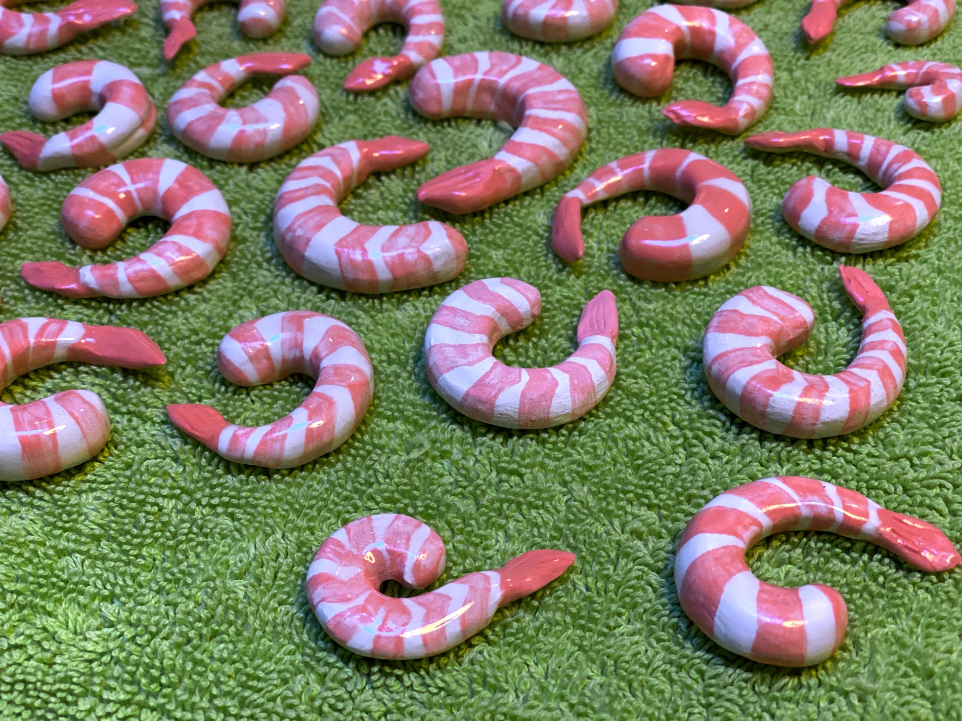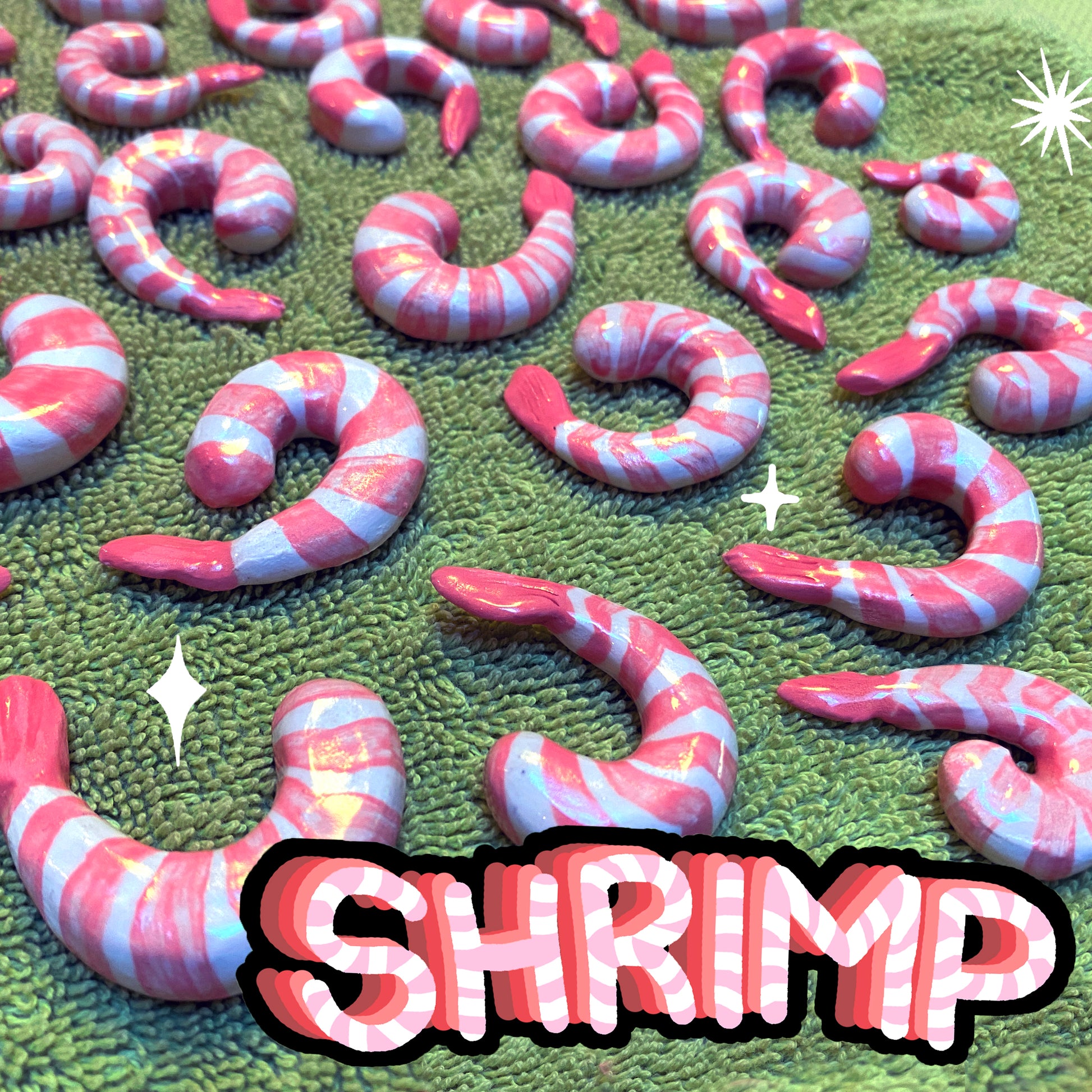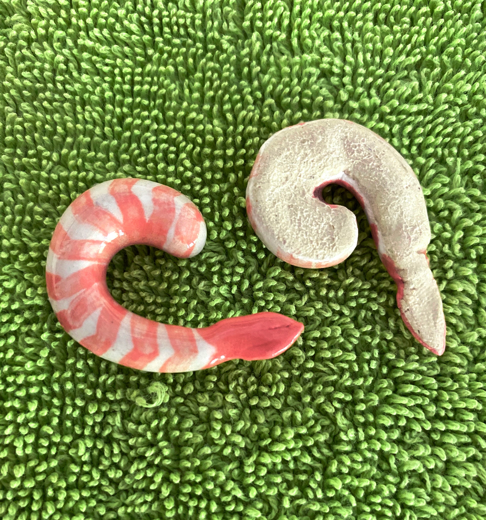 small ceramic shrimp. each is unique. a magnet or pinback can be attached if you email your request after purchase
